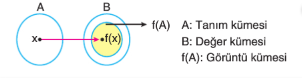 • A kümesinin elemanlarının, f fonksiyonuyla B kümesindeki elemanlardan oluşan kümeye f fonksiyonunun görüntü kümesi denir ve \(f(A) \subseteq B\) dir.